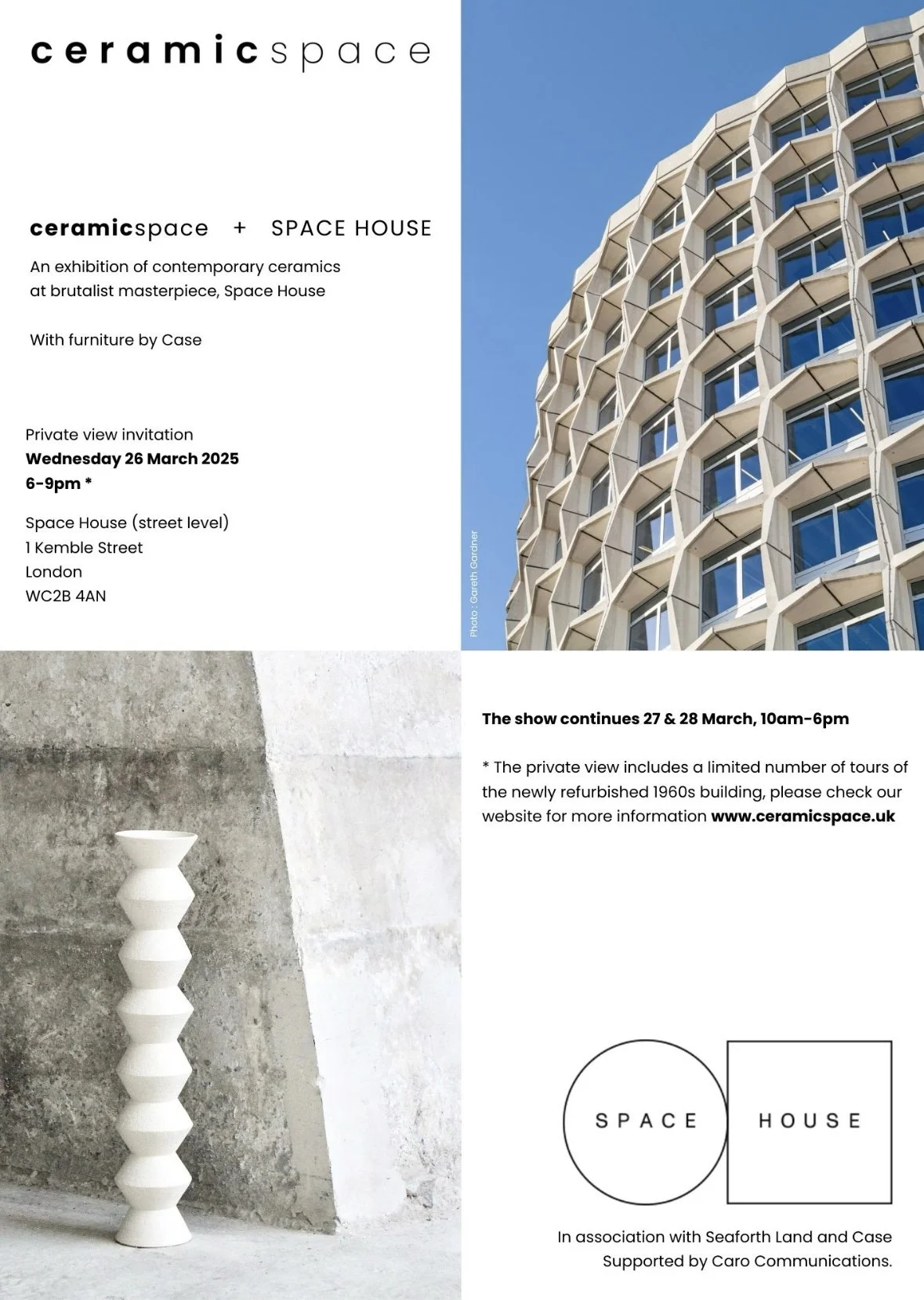Contemporary ceramics meets brutalist architecture in a free, one-off exhibition beneath the concrete Y-columns and fluted canopy in what was originally a petrol station at the base of the landmark 1960s office building, Space House @spacehouselondon